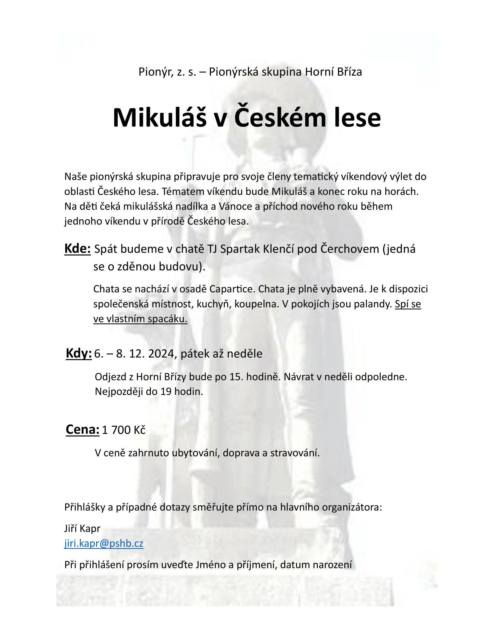 V minulém newsletteru jsme vás zvali na víkendový výlet do Capartic. Pokud máte o výlet zájem, přihlašte se prosím do pátku 30. listopadu 2024 na e-mail jiri.kapr@pshb.cz. Rádi se s vámi uvidíme a času už moc nezbývá.