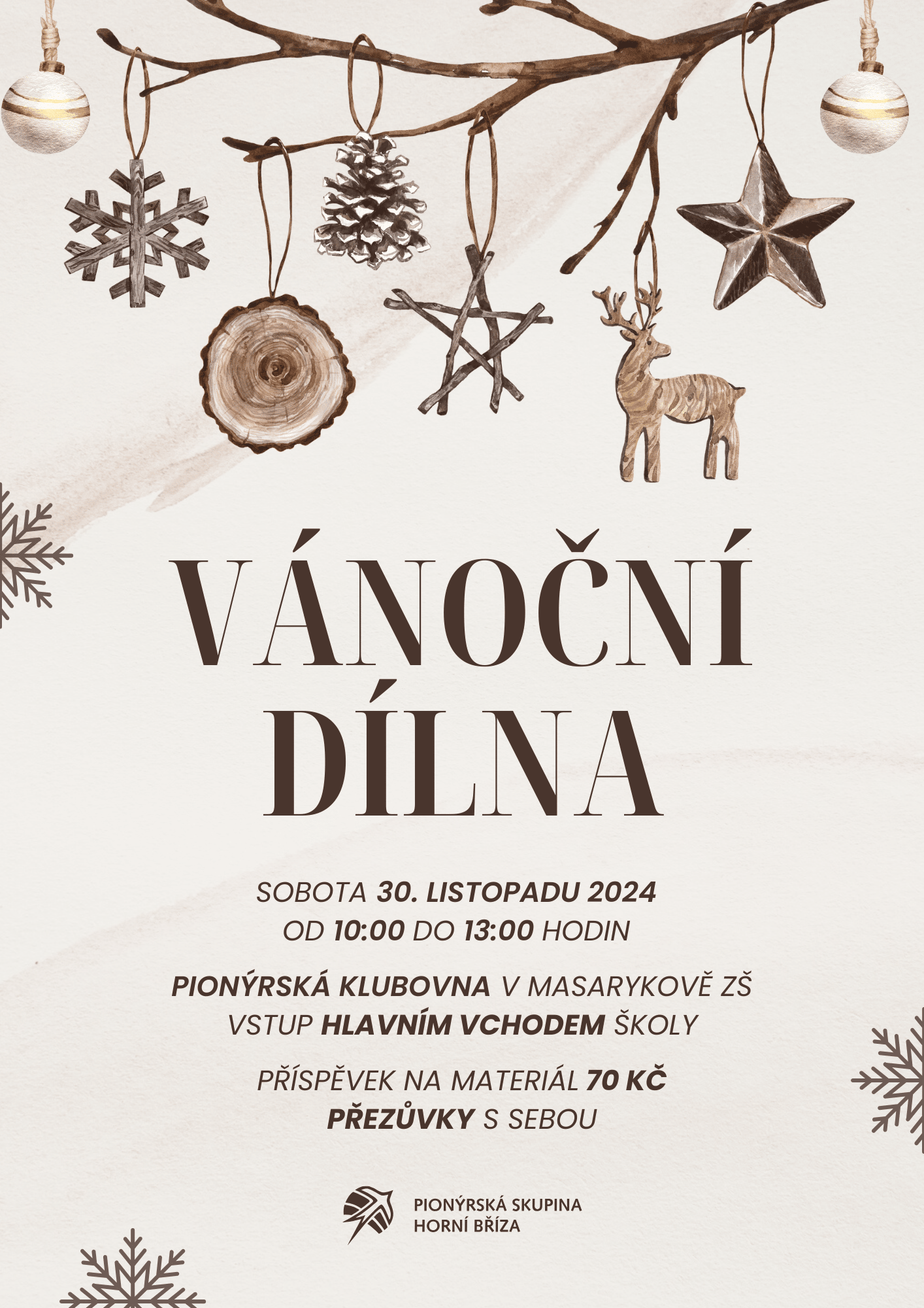 Tradičně jako každý rok bychom vás chtěli pozvat na Vánoční dílnu, která se uskuteční v sobotu 30. listopadu 2024 od 10:00 do 13:00 v naší klubovně v Masarykově základní škole. Přijďte si vytvořit krásné vánoční ozdoby, kterými můžete ozdobit vánoční stromeček a nebo potěšit své blízké. Čekají na vás různé tvořivé aktivity díky kterým si každý malý i velký šikula přijde na své.